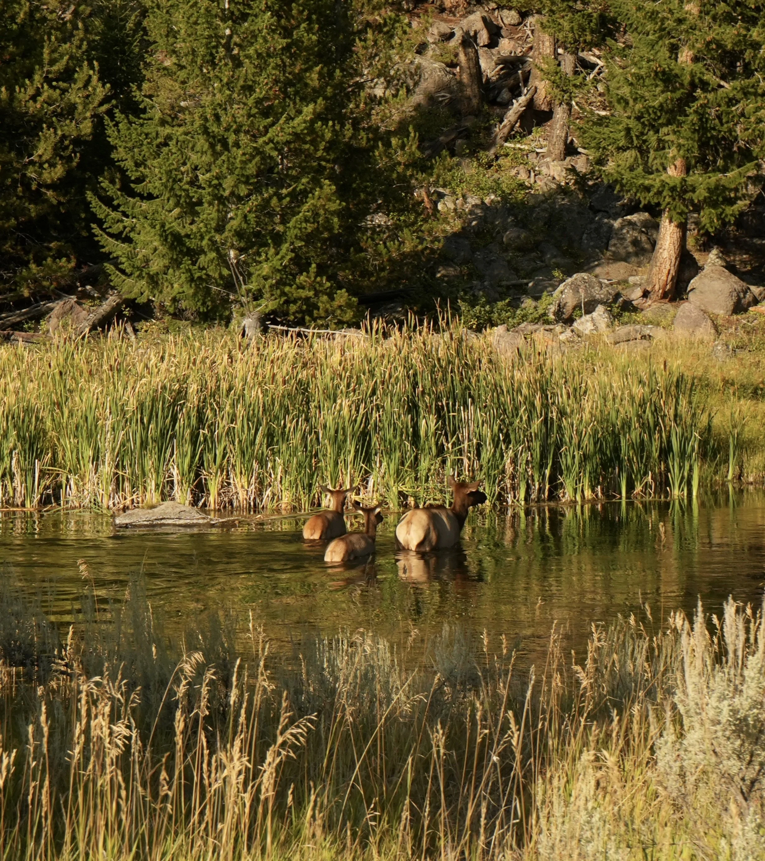 We spotted elk families lounging under trees for an afternoon siesta, their antlers like crowns against the light. Another group splashed in the river, shaking water off in the most playful, unselfconscious way.